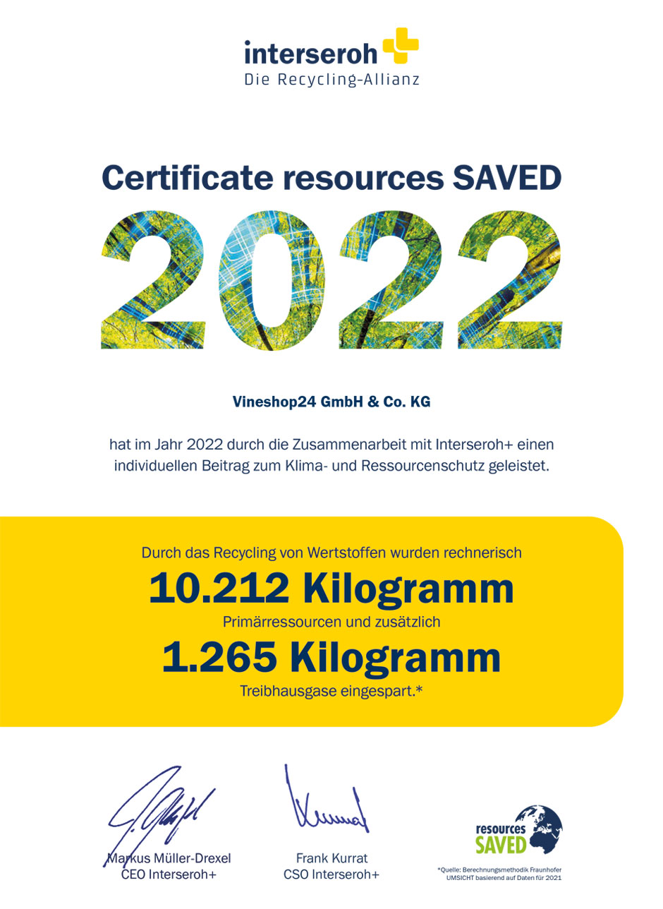 Für verantwortungsvolles Ressourcenmanagement und die beeindruckenden Erfolge im Bereich Treibhausgas-Einsparung erhielt Vineshop24 das Zertifikat Ressourcen GESPART 2022 von Interseroh+. Wir sind stolz darauf, Ihnen dies zu präsentieren, da es den nachhaltigen Umgang mit Ressourcen und den Schutz unserer Umwelt würdigt. Als führendes Unternehmen setzen wir uns leidenschaftlich dafür ein, Treibhausgasemissionen zu reduzieren und einen positiven Einfluss auf den Klimawandel zu nehmen. Mit diesem Zertifikat ermutigen wir andere, unserem Beispiel zu folgen und gemeinsam eine nachhaltige Zukunft zu gestalten. Lassen Sie uns zusammen für eine Welt arbeiten, in der unsere Ressourcen geschützt und unsere Umwelt bewahrt wird.