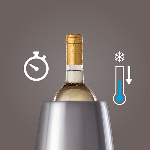 Der Elegant Cooler enthält ein wieder verwendbares Rapid Ice Kühlelement, das eine Flasche innerhalb von 5 Minuten kühlt und danach noch einige Stunden kühl hält.