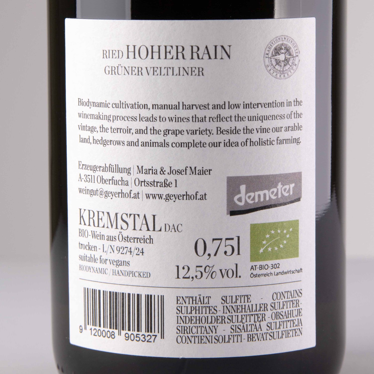 Erleben Sie die exquisite Finesse und die charakteristische Würze des Geyerhof Ried Hoher Rain Grüner Veltliner, einem herausragenden Weißwein aus der renommierten Weinregion Kremstal in Österreich. Im Glas zeigt sich der Geyerhof Ried Hoher Rain Grüner Veltliner in einem leuchtenden Strohgelb mit grünen Reflexen. Das Bouquet besticht durch seine Vielschichtigkeit und Eleganz, mit intensiven Aromen von grünem Apfel, Birne und Zitrusfrüchten, ergänzt durch feine Noten von weißem Pfeffer, Kräutern und einem Hauch von frischen Blumen. Diese frischen und würzigen Aromen werden durch eine dezente Mineralität abgerundet.
