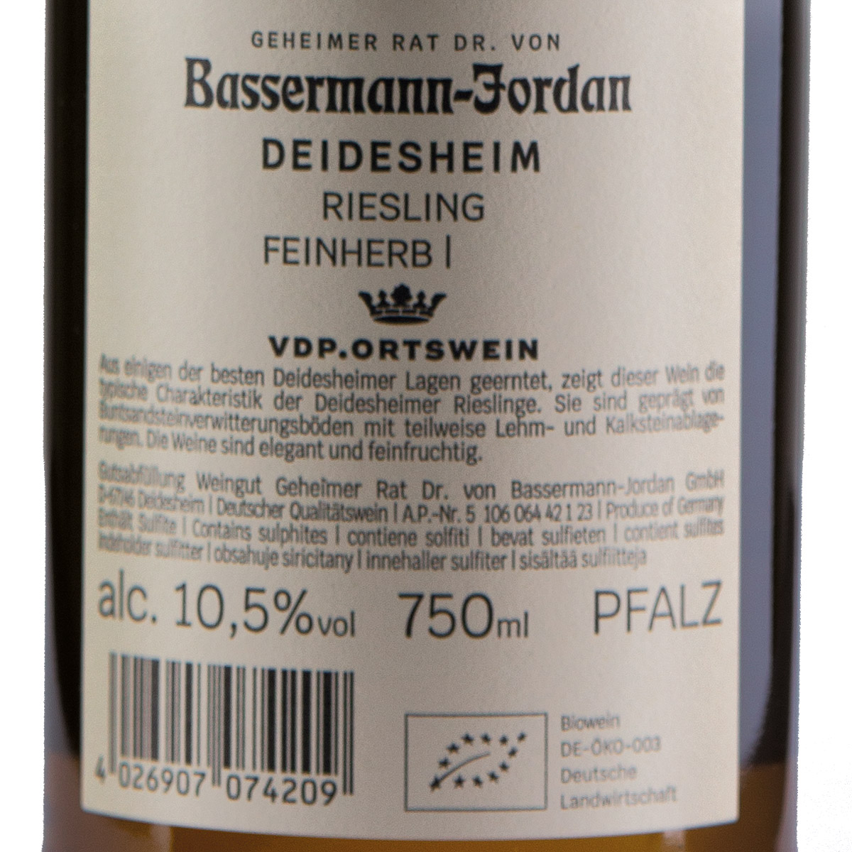 Die Riesling-Trauben stammen aus Lagen um Deidesheim, dem prägenden Weinbauort in der Mittelhardt, dem nördlichen Teil des Weinbaugebietes Pfalz. Einige Riesling-Kreationen aus diesen Lagen haben Weltrang. Das Weingut Geheimer Rat Dr. von Bassermann-Jordan trägt seit Jahrhunderten zu diesem Renommee bei.