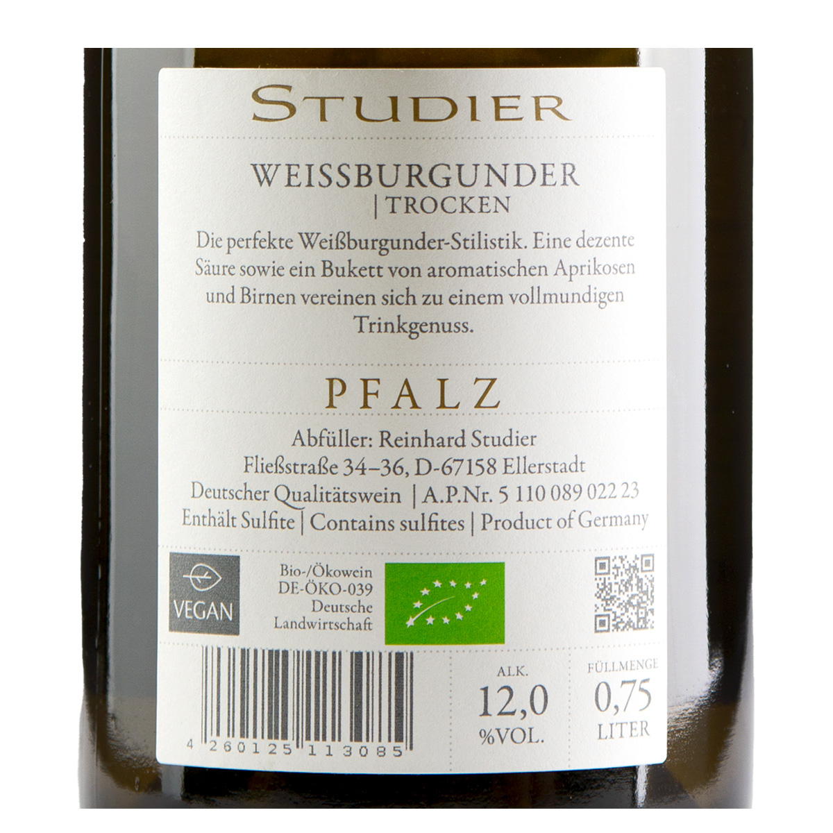 The Studier Weissburgunder (Pinot Blanc) trocken from the Palatinate region smells of apricots and pears, with notes of citrus fruit and pineapple. On the palate, this full-bodied white wine has a striking but pleasant acidity and a lovely melting texture.