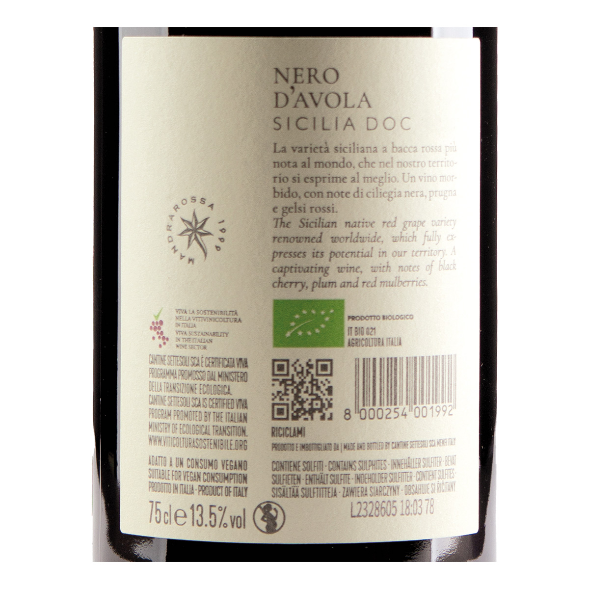 This red wine from the coastal region of south-western Sicily matured for three months in stainless steel tanks and three months in the bottle. Exceptional sunshine conditions, wide temperature ranges, sea breezes and calcareous soils make this Nero d'Avola a great taste experience.