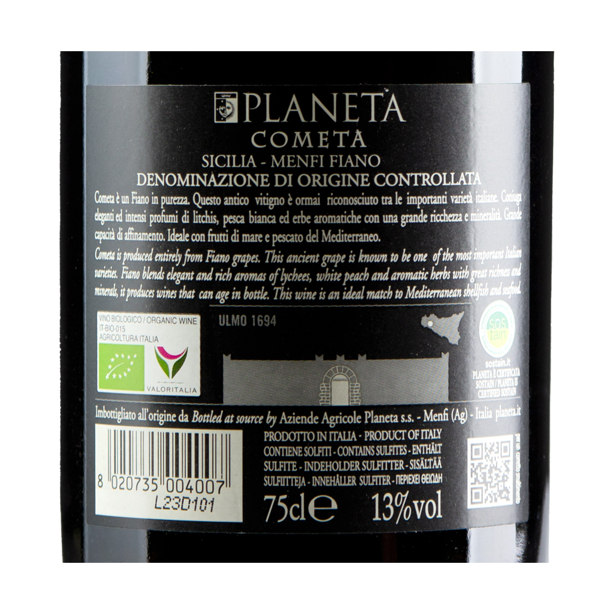 The bouquet of the Planeta Cometa Sicilia Menfi DOC is characterized by notes of mandarin, saffron, chamomile, hay and yellow roses. Silky on the palate, with a beautiful mineral note and plenty of spice. There is a pleasant harmony, particularly towards the finish, and notes of ripe apricots and almond blossom are noticeable. This white wine lingers for a long time.