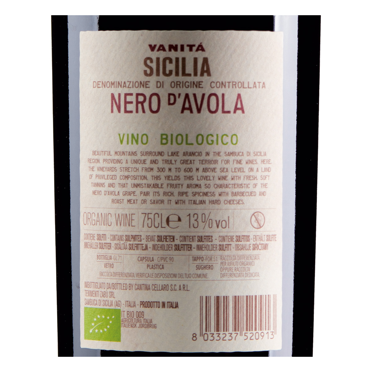This red wine was partly aged in oak casks. It is powerful and full-bodied on the palate, with soft tannins. The Vanita Nero d'Avola IGT is organically produced by the renowned Vigneti Zabu estate.