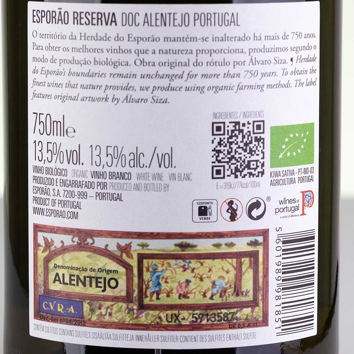 Der Esporão Reserva Branco DOC Alentejo ist ein klassicher Wein von dem Weingut Herdade do Esporão. Die Weinmacher David Baverstock und Sandra Alves verwenden für die Cuvée hauptsächlich die Rebsorten Antão Vaz, Arinto und Roupeiro. Die Trauben stammen von über 18 Jahre alten Weinstöcken. Die Gärung erfolgt mit kontrollierten Temperaturen in Edelstahlbehältern und neuen amerikanischen und französischen Eichenfässern.