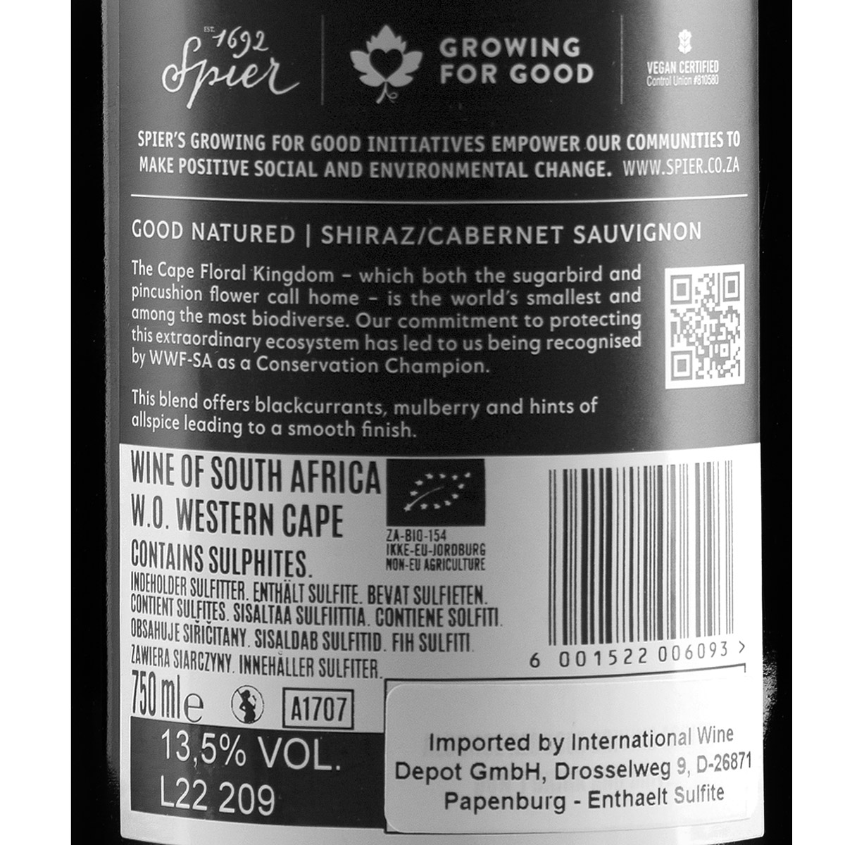 Ein eindrucksvoller Blend aus Südafrika, der dank seiner natürlichen Machart die Vorzüge von südafrikanischem Shiraz und Cabernet Sauvignon authentisch transportiert: Der Spier Good Natured Organic Shiraz Cabernet Sauvignon vereint in seinem Bouquet Noten von schwarzen Johannisbeeren und Maulbeeren, wunderbar harmonierend mit Nuancen von dunkler Schokolade und einer feinen Würze (Piment und schwarzer Pfeffer).