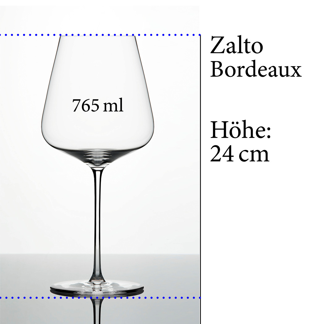 Unser exklusives Bordeaux-Weinglas wird von der österreichischen Premiumweinglas-Marke Zalto hergestellt. Alle Gläser des Unternehmens sind bleifreie, mundgeblasene Kristallgläser.