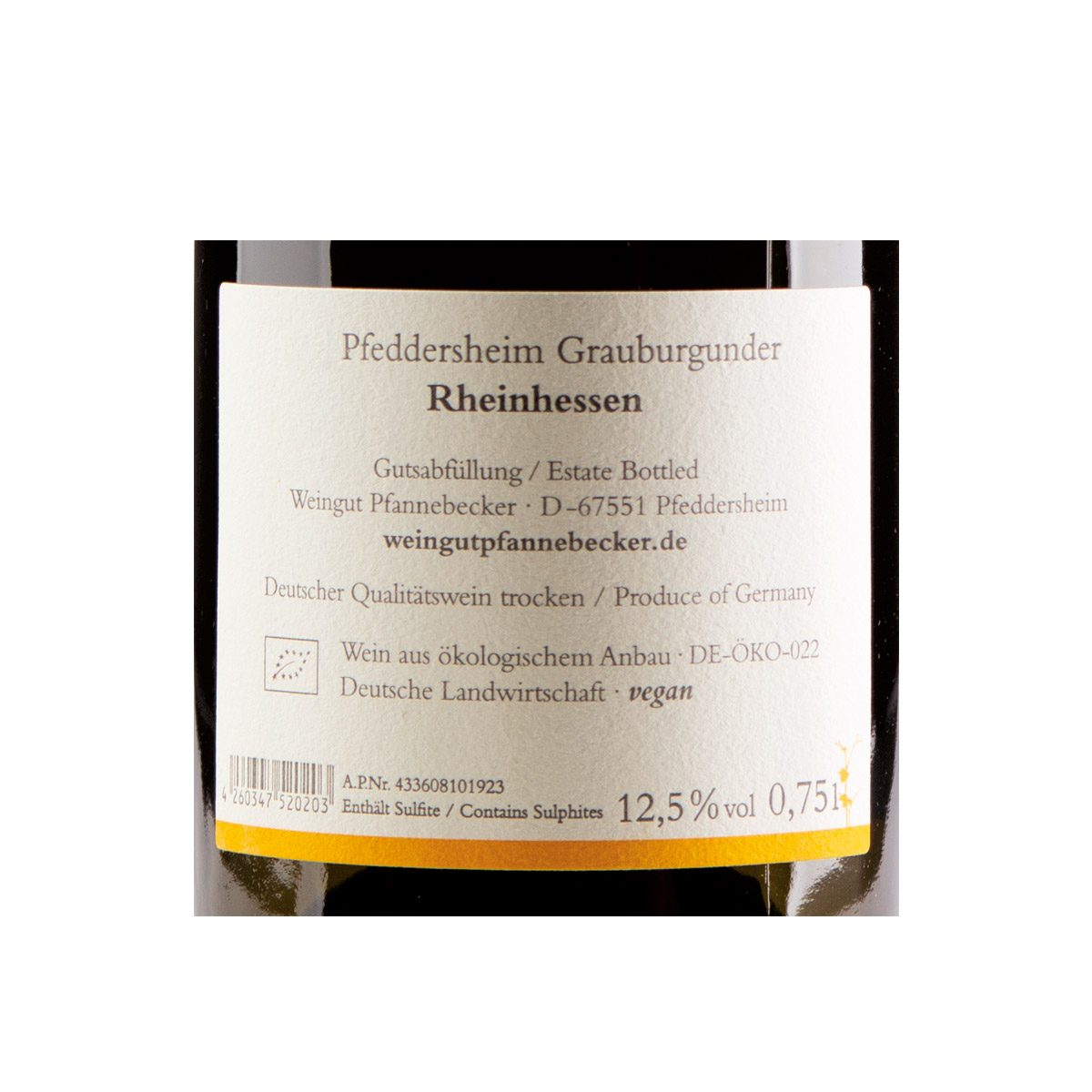 Der Pfannebecker Pfeddersheimer Grauburgunder QbA trocken gehört zu den Ortsweinen des rheinhessischen Weinguts Pfannebecker. Er wächst in den alten Weinbergen der Gemarkung Pfeddersheim. Bereits in der Spätantike wurde hier Wein kultiviert. Heute werden die Lagen mit biologischem Weinbau bewirtschaftet. Der Grauburgunder reift auf natürlicher Hefe der Trauben, zu 50% im großen Holzfass. Bis zur Abfüllung bleibt er auf der Feinhefe.